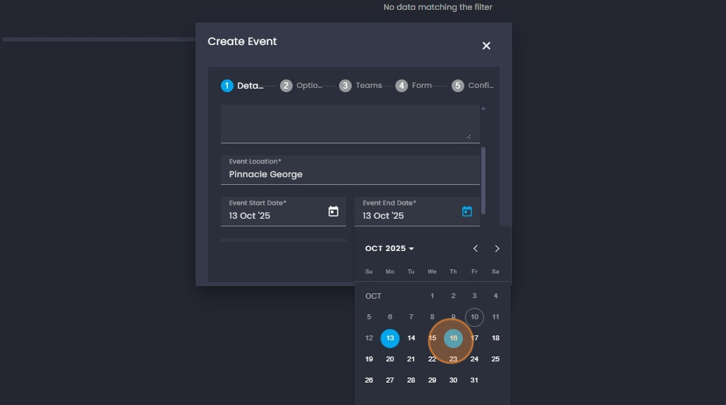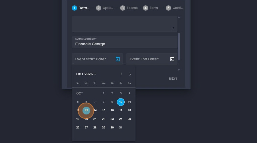10. Click on the "start and end date" to enter the dates of your event.