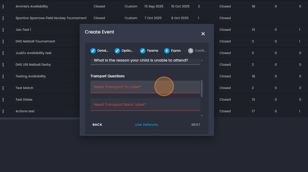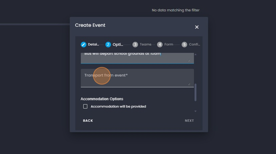 21. Click on the "Transport to event" and add the information regarding the